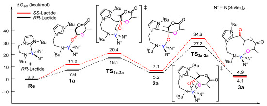 To the best of our knowledge, there is no report on DFT studies on the polymerization of rac-lactide initiated by bifunctional NHC-ligated rare-earth metal catalysts, such as that shown in Scheme 1. Simulated by our previous computational studies on olefin polymerization catalyzed by rare-earth metal complexes [47,48,49,50], we became interested in the ROP of cyclic ester catalyzed by rare-earth metal complexes. To obtain better insight into the mechanism of the reaction shown in Scheme 1 as well as to establish the role of the bifunctional catalyst in the ROP of lactide, DFT calculations were performed for the initiation and propagation of lactide ROP catalyzed by an NHC-ligated yttrium complex (Scheme 1). It was found that the carbonyl of lactide is attacked by the N(SiMe3)2 group rather than the NHC moiety. The steric repulsion between the incoming monomer and the ligand framework plays an important role in the heterotactic selectivity.