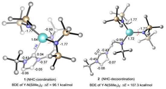 The bond dissociation energy of Y–N(SiMe3)2 in the coordination and de-coordination of the N-heterocyclic carbine (NHC) moiety. NBO (Natural bond orbital) atomic charges are given in black. All H atoms are omitted for clarity.