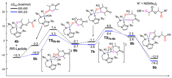 As aforementioned, in the chain initiation step, the reaction of (R,R)-lactide is more kinetically favorable than that of (S,S)-lactide. To explore the origin of stereocontrol in the rac-lactide polymerization, the insertions of both (R,R)- and (S,S)-lactide monomers were calculated in order to model the chain propagation on the basis of the resulting insertion product of the (R,R)-lactide 4b. As shown in Figure 5, the incoming monomer coordinates to 4b to form 5b, which could undergo a migratory insertion and subsequent ring-opening to finally give 9b, accompanied by structure isomerizations. A comparison of the coordination complex 4b indicates that the (S,S)-lactide is more thermodynamically favorable to coordinate to the metal center than its stereoisomers (relative energies of −10.0 vs. −3.2 kcal/mol). Kinetically, the ring-opening via TS7b-8b is the rate-determining step for both cases. Also, the free energy barrier for the case of (S,S)-lactide is 18.7 kcal/mol relative to 4b and the free monomer, which is lower than that for the case of its enantiomeric form (20.9 kcal/mol). These results suggest that the reaction of 4b with (S,S)-lactide is more favorable compared with (R,R)-lactide. This results in the (R,R)-(S,S) sequence, which is in line with the experimentally observed heterotactic selectivity. Considering that an achiral initiator cannot not lead any enantioselectivity in the chain initiation step, the case of (S,S)-enantiomer is also used for modeling the chain propagation. Actually, on the basis of the (S,S)-lactide-initiated product 4b(S,S), the subsequent reaction of the (R,R)-monomer is also more favorable than (S,S)-lactide, yielding the (S,S)-(R,R) heterotactic sequence (Figure S1).