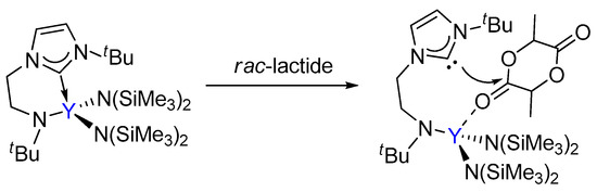 Arnold had reported that the ROP of lactide catalyzed a yttrium complex featuring an NHC tethered moiety. Such a yttrium complex showed high activity and stereoselectivity toward the ROP of rac-lactide, resulting in a heterotactic based PLA (Scheme 1) [35]. In the same work, it was proposed that the polymerization occurs through a bifunctional mechanism involving electrophilic activation of the monomer by Lewis acidic metal centre Y and nucleophilic attack of the labile NHC fragment on the activated monomer (Scheme 2). However, the influence of the bifunctional catalyst on the mechanism of this reaction and the origin of stereocontrol, which is interesting and important for catalyst design, has remained unclear.