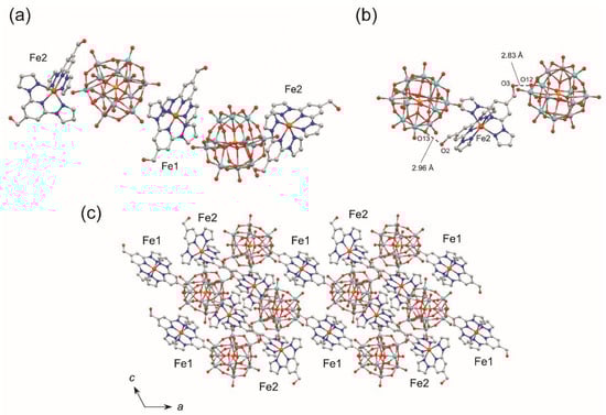 The Fe(II) ions in 1 were found to be in a distorted octahedral coordination geometry where the angle of trans-N(pyridine)–Fe–N(pyridine) (φ) and the sum difference of the twelve possible cis-N–Fe–N angles (α) from the perpendicular (Σ, where Σ = Σ|90 − α|) [11,12] were found to be φ = 158.1° and Σ = 151°, respectively, with an average Fe–N bond length of 2.2 Å. These values are highly typical of high spin Fe(II) and 1 can therefore be assigned as assuming a high spin configuration. In the packing structure of 1, both pendant hydroxyl groups on the dppOH ligands hydrogen bond to a bridging µ2-oxo group on the [PMo12O40]3− anion (Figure 2b), where the distance between the oxygen atoms of the hydroxyl groups and the µ2-oxo bridges (dO1…O33 and dO2…O28) are 2.94 Å and 2.85 Å, respectively. The dense packing arrangement observed in 1 leads to distorted coordination structure, exerting a strong influence on the coordination environment parameters of the Fe(II) centers and stabilizes its high-spin state.