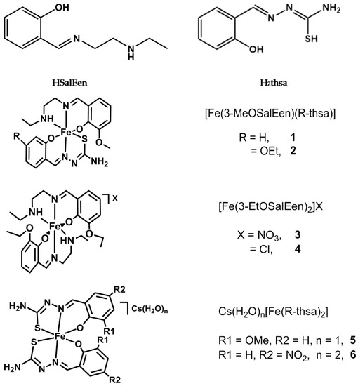 Molecular structures of HSalEen and H2thsa ligands together with Fe(III) compounds 1–6. Note that the actual coordination of the Fe(III) compounds will be discussed vide infra, the pictures shown here clarify the molecular components only.