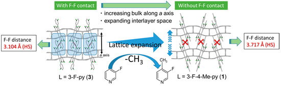 Cell volumes, SCO behavior type, and Tc for 1–6 are summarized in Table 1. It is noted that the cell volume clearly shows an expansion with the increase of the substituent bulk. The compounds from smallest to largest are as follows: 3-F-py (1915.7 Å3) < 3-Methyl-py (1976.3 Å3) < 3-Br-py (1990.9 Å3) < 4-Methyl-py (2112.5 Å3) < 3-F-4-Methyl-py (2155.2 Å3) < 3-Br-4-Methyl-py (2209.7 Å3). In spite of the lattice expansion, these compounds completely maintain a bilayer structure.