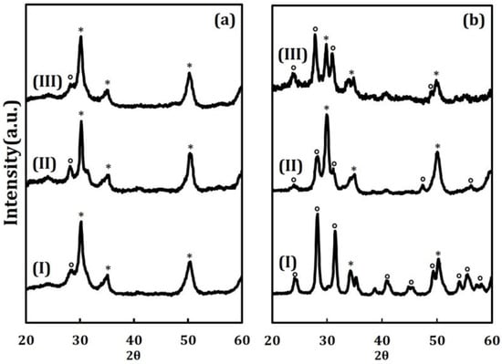 2 indicates that the material is primarily in the tetragonal form, as shown by the large peak at 30 degrees 2θ, but with a small amount of monoclinic phase, shown by the small peak near 28 degrees 2θ. The deposition of 20 ALD cycles of either CeO