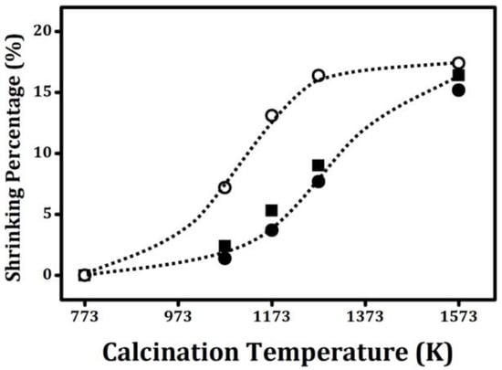 2 wafers as a function of calcination temperature. Not surprisingly, the ultimate shrinkage after calcination to 1573 K was the same for each of the materials: ~16%; however, pure ZrO