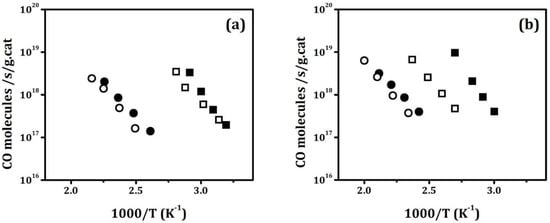 CO oxidation rates were measured at differential conversions in a tubular flow reactor, using a gas chromatograph (SRI8610C) equipped with a Hayesep Q column and a TCD detector to measure effluent concentrations. The total gas flow rate through the reactor was 120 mL·min−1, and sample size was 0.10 g in all experiments. The partial pressures of CO and O2 were fixed at 25 and 12.5 Torr, respectively, by adjusting the flow rates of CO, O2, and He.