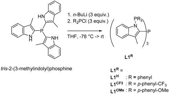 Ligands L1H and L2H were prepared in two steps from 3-methylindole as previously reported by our group [14,15]. The new ligands L1CF3 and L1OMe were prepared in a similar way to L1H, by reacting tris-2-(3-methylindolyl)phosphine [17] with the corresponding chlorodiarylphosphine (Figure 1).