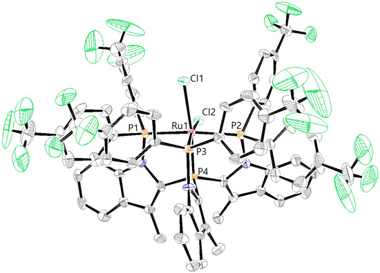 ORTEP drawing of RuCl2L1CF3 (CCDC 1574141) showing one of the two rotamers. Thermal ellipsoids are set at 50% probability. Solvent molecules and hydrogen atoms have been omitted for clarity.