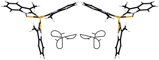 However, different than the L1-based complexes, where the methyl groups are pointing towards the central phosphine (Figure 5), in complex RuCl2L2H, the bulkier phenyl rings of the indolyl moiety point towards the central phosphine (Figure 8). From the crystal structure, it appears that these phenyl rings should encounter more hindrance toward inversion and it therefore seems likely that this process is associated with a high energy barrier in solution. As a result, the two phosphine atoms (P1 and P2, Figure 7) in trans position become inequivalent, leading to the observed AX pattern in the 31P NMR spectrum as a result of the P1–P2 coupling.