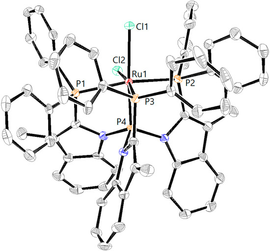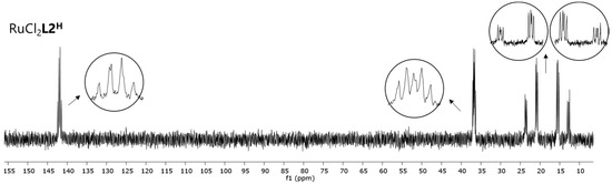 All three L1-based RuCl2L1 complexes show similar 31P NMR spectra: three signals in a ratio 1(td):2(t):1(td) (Figure 3). This splitting pattern indicates the formation of a symmetric complex. Ruthenium(II) complexes tend to form octahedral 18-valence electron complexes, and X-ray analysis and NMR spectroscopy confirmed that complex RuCl2L1H indeed features an octahedral geometry with the two chlorides in mutual cis position and all four phosphines bound to the metal center [15]. The above factors and the similarity of the 31P NMR spectra of the other L1-based complexes point to the same octahedral geometry around the metal center.
