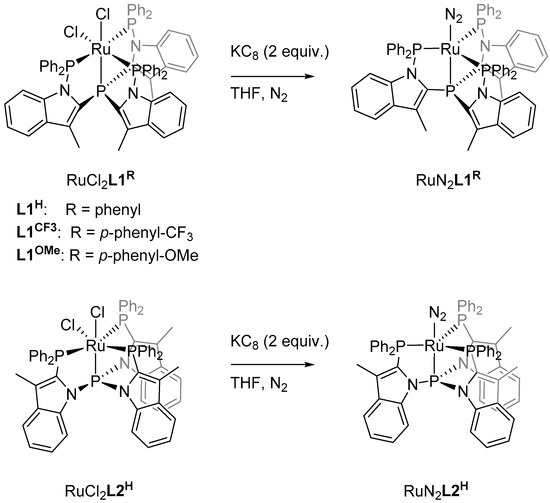 Two-electron reduction of RuCl2L1H under an N2 atmosphere led to the formation of the RuN2L1H complex, which features a characteristic infrared band corresponding to the coordinated N2 at 2125 cm−1 (Table 2) [15]. To explore if the electronic properties of the ligands L1CF3, L1OMe, and L2H have an influence on the binding of N2 to Ru0, the corresponding N2 complexes were generated in situ by reacting the ruthenium(+II) complexes with two equivalents of KC8 (Figure 9). The extent of activation of the N2 bond was quantified by measuring the N≡N stretch frequency with infrared spectroscopy, as this is a direct measure for the ligand-dependent π-back-donation. Table 2 shows the N2 stretch frequencies of the Ru0N2L complexes.