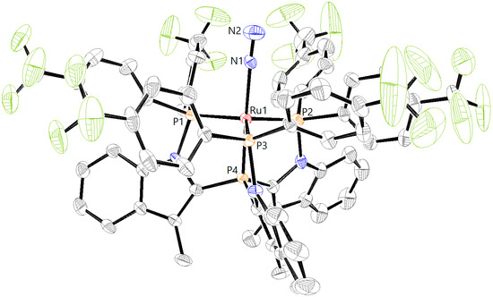 Layering of a THF solution of RuN2L1CF3 with pentane resulted in the formation of single crystals suitable for X-ray diffraction (Figure 10). Similar to the RuN2L1H complex reported previously [15], RuN2L1CF3 also shows a trigonal bipyramidal geometry. The N≡N bond is slightly shorter in RuN2L1CF3 (1.064(5)°) than in RuN2L1H (1.085(5)°) (Table 1), which is in accordance with the observed trend in the activation of the N2 stretch frequency (Table 2). In solution, these complexes remain trigonal bipyramidal, as judged from the occurrence of a doublet and a quartet in all 31P NMR spectra.