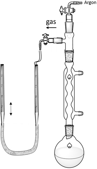 Hydrogen evolution was initiated by the addition of formic acid (45 μL, 1.2 mmol) to a solution of catalyst (±8.5 μmol) in refluxing THF (3 mL) in a 10 mL reaction flask equipped with a condenser. The gas was cooled via a condenser, with the outlet connected to a burette filled with water (Figure 15). The displacement of the water level in the burette was measured in time. The second burette was also filled with water and used to compensate for pressure buildup, keeping the water levels at equal height. The results are shown in Table 5.