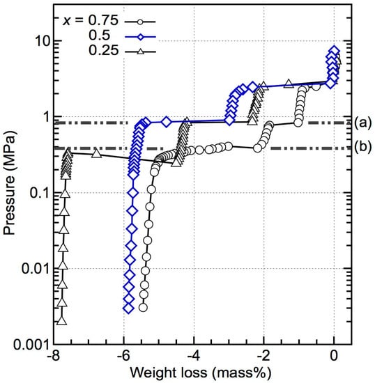 The PCT results obtained at 643 K for the composites (x = 0.25, 0.5, and 0.75; temperatures were slightly different within each measurement) are shown in Figure 1. Although only one dehydrogenation event was observed for the x = 0.5 and 0.75 composites in the dynamic TG–MS measurements, the PCT results revealed two and three thermodynamically independent reactions, respectively. For x = 0.25, three independent reactions were observed, similar to the TG–MS results in which multiple dehydrogenation events appeared. The first and second dehydrogenation reactions of all of these compositions exhibited the same equilibrium pressure of 1.85 MPa and 0.85 MPa, which indicates that these compositions have undergone similar reaction pathways.