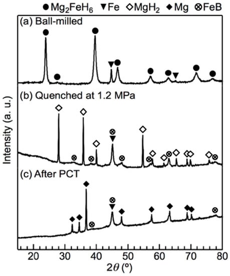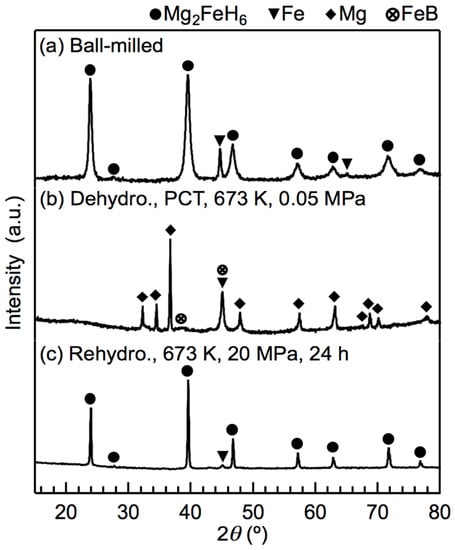 XRD profiles of the x = 0.5 composite before and after rehydrogenation at 673 K and 20 MPa H2: (a) the material immediately after ball milling; (b) the material dehydrogenated at 673 K via a PCT measurement, and (c) the material rehydrogenated at 673 K and 20 MPa H2.