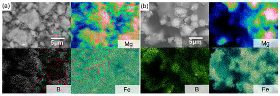 The backscattering images (BSE) and energy-dispersive X-ray spectroscopy (EDX) analysis results obtained before the PCT measurements and after the first reaction are shown in Figure 3. Before the PCT measurement, the composite material was a uniform mixture; separate LiBH4 and Mg2FeH6 particles were not observed at about 100-nm scale. After the first isothermal reaction at 1.85 MPa, the composite became an obvious mixture. A large blank area was observed where no B, Fe, or Mg were detected, suggesting that this area was possibly composed of the dehydrogenation product of LiBH4: LiH. These results complement the XRD results, indicating that both LiBH4 and Mg2FeH6 underwent dehydrogenation in the first reaction. Element mapping of Fe and B showed significant overlap, and the particle size was of the order of several nanometers, indicating the possible formation of iron boride. A 1:1 reaction ratio between LiBH4 and Mg2FeH6 in the first isothermal reaction suggests that FeB is a possible iron boride product. The recognized diffraction patterns in the XRD results can be attributed to FeB (orthorhombic, Cmcm), but the very broad peaks made the phase identification difficult. Because of the overlapping of the strongest diffraction peaks of Fe (cubic, Im-3m) and FeB, it is hard to rule out the existence of Fe. Therefore, we still keep it in the reaction of Equation (2). The formation of FeB is crucial for the reaction between LiBH4 and Mg2FeH6. The estimated enthalpy change ΔH and entropy change ΔS for the reaction (LiBH4 + Mg2FeH6 → LiH + 2MgH2 + FeB + 5/2H2) is 64 kJ/(mol of H2) and 125 J/K(mole of H2) , respectively. According to the theoretical value, the equilibrium pressure at 643 K would be 2.1 MPa [23,25,26,27]. It is very close to the experimental data 1.85 MPa.