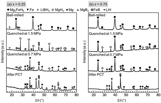 XRD profiles of (a) x = 0.25 and (b) x = 0.75 composite during the PCT measurement at 643 K: the ball-milled material before the PCT measurement; the material quenched at 1.5 MPa, which is the pressure after the first isothermal reaction at 1.85 MPa; the material quenched at 0.7 MPa, which is the pressure after the second isothermal reaction at 0.85 MPa; and after the PCT measurement. The strongest diffraction peak of LiH overlapped with that of Fe at 44°.