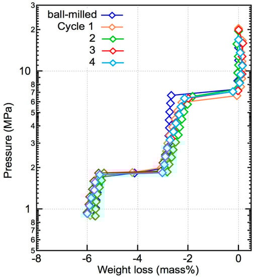 The PCT plots of the dehydrogenation part during the reversible hydrogenation tests at 673 K are shown in Figure 7. The equilibrium pressure of the reaction between LiBH4 and Mg2FeH6 at 6.8 MPa and that of the dehydrogenation reaction of MgH2 at 1.8 MPa remained stable, indicating that the properties of the composite materials did not degrade after cycling. The weight loss during each cycle did not decrease, suggesting that the composite material was fully rehydrogenated.