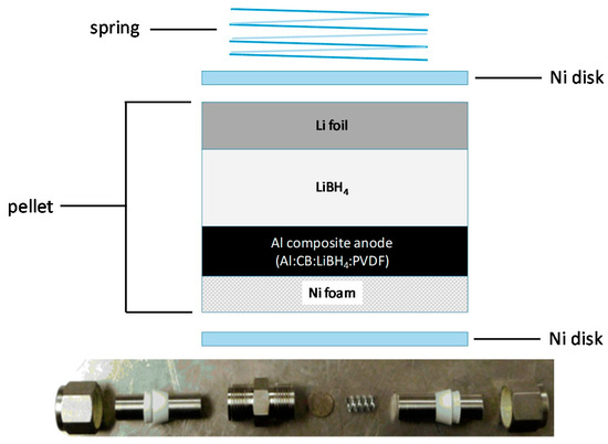 To determine if aluminum can be lithiated in the solid state, a composite electrode was prepared with aluminum as the active material (Al), LiBH4 to facilitate Li+ ion transport through the composite, carbon black (CB) to provide electrical conductivity, and polyvinylidene fluoride (PVDF) as a binder. The composite anode was pressed into a nickel foam (~2–4 mg) and then pelletized with LiBH4 (~90 mg). Li foil was then attached to the opposite side and the pellet was sandwiched between two nickel disks and compressed with a spring inside of a 1/2 in. Swagelok union with two electrode posts (Figure 2). To enhance the ionic conductivity of LiBH4 and allow for the even distribution of the solid electrolyte throughout the aluminum composite anode, it was Spex milled as previously described [38,39].