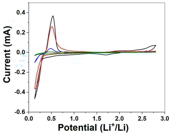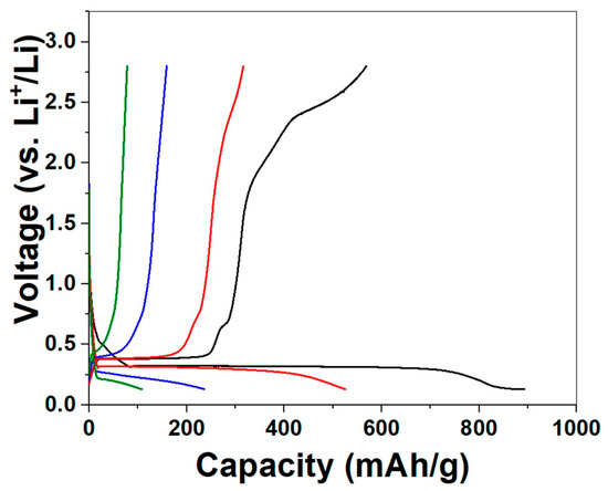 Lithiation/delithiation cycles of the Li/LiBH4/Al composite cell. Cycling was performed at 0.1 C between 0.13 and 2.8 V (vs. Li+/Li) at 135 °C. Cycle number: Black—1st, Red—2nd, Blue—5th, and Green—10th.