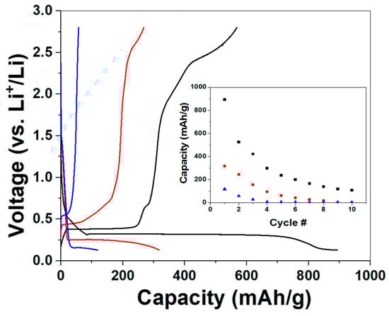 Effect of cycling rate on the first cycle capacity of the Li/LiBH4/Al composite cell at 135 °C. Inset shows the capacity as a function of cycling rate over the first 10 cycles. Black—0.1 C, Red—0.5 C, and Blue—1.0 C.