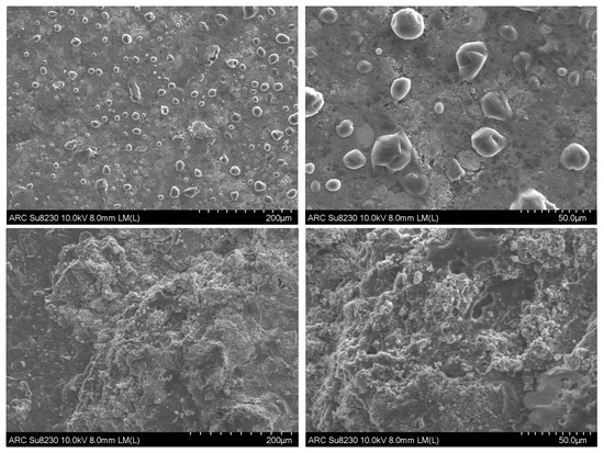To understand how the morphology of the Al composite electrode changed with cycling, SEM analysis was performed (Figure 6). SEM clearly showed the presence of spherical shaped particles (20–40 μm in diameter) and a relatively smooth surface of the electrode in the as prepared state. However, after the lithiation cycle of the aluminum, these spherical particles are no longer present. Additionally, the surface increases in roughness and the formation of voids within the electrode are clearly present. The formation of a rough surface and the creation of voids within the electrode could be due to the lattice expansion that occurs during the lithiation of aluminum to form the LiAl alloy. Going from metallic aluminum to the LiAl alloy results in a 97% expansion in the lattice [42]. However, this is significantly less than the lattice expansion during the lithiation of Si to Li22Si5 and Sn to Li22Sn5 which are 323% and 300% [43] respectively. The expansion of these 3 alloys are all significantly more than the graphite electrode currently utilized in commercial LIB, which expands only 9% upon lithiation [44].
