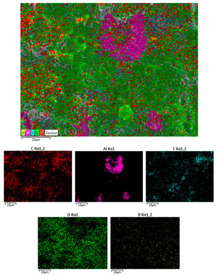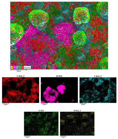 SEM-EDS of the aluminum composite anode in the initial state. The top image is the composite map of carbon, aluminum, fluorine, oxygen, and boron elemental distribution. The bottom images are the individual atomic distributions of the elements.