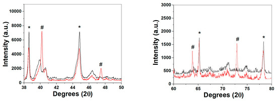 XRD of the aluminum anode composite before (black) and after the 1st lithiation cycle (red). The left and the right panels show the low 2θ and high 2θ respectively. Aluminum (*, pdf 00-0040787) and LiAl alloy (#, pdf 01-072-3428).