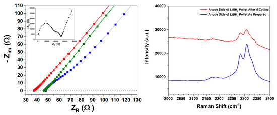 (Left) Electrochemical impedance spectroscopy (EIS) of the Li/LiBH4/Al cell. The inset (black) shows the cell at room temperature. The other 3 EIS traces are for the cell at 135 °C before cycling (blue), after the 1st cycle (red), and after the 10th cycle (green). (Right) Raman spectra of the B–H stretching modes of LiBH4 in the as prepared electrolyte pellet from the anode side (blue) and after cycling five times (red).