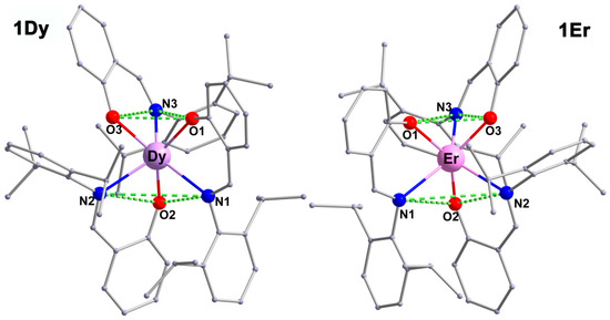The molecular structures of complexes 1Dy (left) and 1Er (right). The dashed green lines represent the basal planes. Hydrogen atoms have been omitted for clarity.