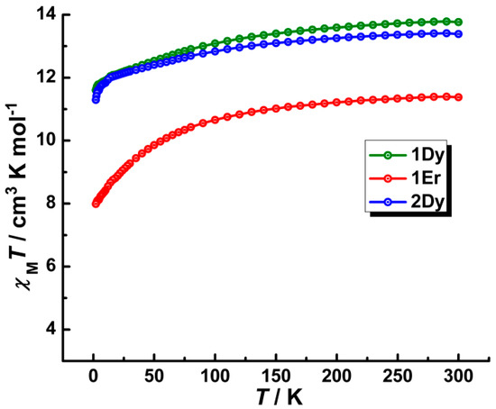 Plots of the χMT versus T for 1Dy, 1Er and 2Dy in an applied field of 1 kOe.