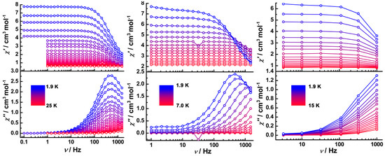 For complex 2Dy, both in-phase (χ′) and out-of-phase (χ″) ac susceptibilities exhibited frequency (Figure 4) and temperature (Figure S13, Supplementary Materials) dependency under a zero dc field, indicative of slow relaxation of magnetization. However, no peaks of χ″ were observed, indicating the presence of fast QTM relaxation.