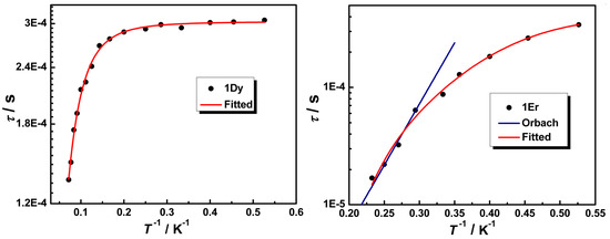 Plots of τ versus T−1 for 1Dy (left) and 1Er (right), respectively. The red lines correspond to the best fits, and the blue line corresponds to the Orbach process.