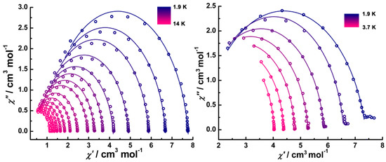 Cole-Cole plots for 1Dy (left) and 1Er (right) at the indicated temperature; the solid lines correspond to the best fits.
