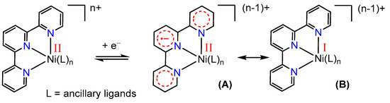 Non-innocent ligands [34,35,36,37,38,39] such as tpy contribute strongly to the electron inventory of such nickel complexes, and redox chemistry may often occur at the ligand in addition to the abovementioned oxidation states (0, +I, +II, +III, and +IV). For instance, since tpy is an excellent electron acceptor through its extended π system, a species resulting from the reduction of a nickel(II)-tpy complex can be described in two different resonance forms: as a divalent nickel bound to a radical anionic (tpy)•− ligand [Ni(II)(tpy•−)](n−1)+ (A), or as a monovalent nickel [Ni(I)(tpy)](n−1)+ complex (B) (Scheme 1) [40,41].