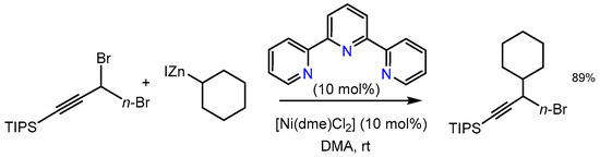 When propargylic secondary bromides and chlorides were used as the electrophiles, secondary alkylzinc reagents could be coupled, producing two adjacent secondary carbon centers using the nickel–terpyridine catalyst system (Scheme 4) [48].