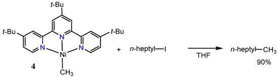 The reaction of a nickel(0) precursor with MeI in the presence of a tpy derivative provided the cationic methylnickel(II) complex 3 (Scheme 5). In a related reaction, the treatment of [Ni(tmeda)(Me)2] with the same terpyridine ligand gave the neutral complex 4 [45,46]. Reaction of the cationic nickel(II) complex 3 with an alkylzinc reagent gave only a 8% yield of the cross-coupled product (Scheme 5). On the other hand, the neutral methylnickel(I) complex 4 reacted with n-heptyliodide to give the corresponding coupling product in 90% yield (Scheme 6). These results suggest that the Ni-tpy catalytic system does not include a simple Ni(0)/Ni(II) mechanism comprising of an oxidative addition of alkyl halides at nickel(0), transmetalation of a nickel alkyl halide complex, and lastly, reductive elimination of carbon–carbon bonds (Scheme 7).