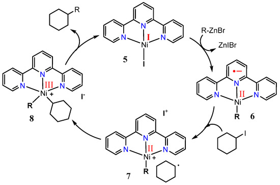 Proposed catalytic cycle of the nickel–tpy catalytic system in an alkyl–alkyl cross-coupling reaction, adopted from ref. [46], the oxidation states shown in red were the results of studies outlined in Section 2.2 and Section 2.3.