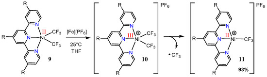 Vicic showed that trifluoromethyl ligands can support the five-coordinate nickel(II) species 9, which can be chemically oxidized with [ferrocenium][PF6] to generate the transient nickel(III) species 10 (Scheme 8) [54]. Once formed, however, 10 undergoes a reductive homolysis of a trifluoromethyl ligand to afford the cationic nickel(II) species 11. Spectroelectrochemical EPR studies supported the intermediacy of 10, but its short-lived nature precluded any fundamental studies of its reactivity. Quite clearly, a •CF3 radical is cleaved from 10, which was shown through spin-trapping studies using PBN (N-t-Bu-α-phenylnitrone) [54].