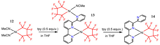 It was found that the addition of terpyridine to [Ni(MeCN)2(C4F8)] 12 led cleanly to the formation of [Ni(tpy)(C4F8)] 14 (Scheme 9) [55]. Surprisingly, in the solid state, the terpyridine ligand in 14 coordinates to nickel in a η2-fashion. However, solutions of 14 are paramagnetic, supporting an equilibrium with the η3-binding mode. Interestingly, when 0.5 equiv. of terpyridine is added to 12, the bimetallic species 13 can be isolated reproducibly, which is a testament to the lability of the acetonitrile ligands. Terpyridine is known to bind to more than one metal center [56,57,58,59,60,61], but 13 represented the first such adduct with nickel.