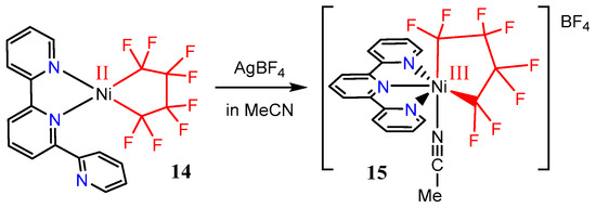 Oxidation of the [Ni(tpy)(C4F8)] complex 14 was explored. The η3-binding of the terpyridine ligand generates a high-spin nickel complex which, upon addition of Ag[BF4], affords the bluish/purple nickel(III) species 15 (Scheme 10). Unlike complex 10, which readily loses a trifluoromethyl radical, there is no evidence that 15 loses a perfluoroalkyl radical, even upon standing for hours in MeCN solution. The stability of 15 facilitated its characterization by X-ray crystallography, which identified the addition of an acetonitrile to the coordination sphere.