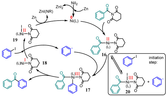 Recently, Han et al. reported on Ni-catalyzed reductive cross-coupling reactions between two electrophiles, amides and aryl iodides [62]. The nickel–tpy catalysts system turned out to be superior to catalysts containing the bidentate ligands 2,2′-bipyridine, 2,2′-biquinoline, 1,10-phenanthroline, and its 5,6-dione. In a mechanistic proposal (Scheme 11), the starting NiI2 is reduced in the presence of tpy (L) to [Ni(0)(L)] by the added metallic Zn, and the encompassing C–N bond activation of the amide is described as an oxidative addition to yield an [Ni(II)(L)(acyl) (amide)] species 16. This complex reacts with an aryl radical stemming from the aryl iodide substrate, and forms the [Ni(III)(L)(acyl)(amide) (aryl)] species 17 through a radical oxidative addition. This species cleaves the C–C coupling product, leaving an [Ni(I)(L)(amide)] complex 18. The Ni(I) species reacts with aryl iodide to produce the aforementioned aryl radical, and the resulting [Ni(II)(L)(amide)I] 19 is subsequently reduced to [Ni(0)(L)] by metallic Zn to restart the cycle. In addition to the production of the aryl radical through complex 18, 16 could also react with Ph-I to yield this radical in an initiation step forming another Ni(III) species 20. As a proof for the radical oxidative addition reaction, the addition of TEMPO (TEMPO = 2,2,6,6-Tetramethylpiperidin-1-yl)oxyl) inhibited the reaction and yielded the acyl–TEMPO adduct. Furthermore, [Ni(COD)2] was also successfully used as the catalyst precursor, underpinning the role of the metallic zinc [62].