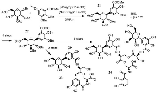 Gagné et al. achieved a total synthesis of a family of salmochelins, which are metabolites of the ferric-binding siderophores produced by E. coli and S. enterica. A key step in the synthesis was the nickel-catalyzed cross-coupling reaction of a bromoglucose derivative with an arylzinc reagent employing the terpyridine ligand on nickel [68]. The key coupling reaction proceeded with excellent diastereoselectivity in a good yield to give 21 (Scheme 13). The C-aryl glycoside 21 was successfully converted into salmochelin S1 23 and S2 24 by subsequent condensation and deprotection processes (Scheme 13) [69]. Moreover, Gagné also found that the combination of terpyridine and [Ni(0)(COD)2] (COD = 1,5 cyclooctadiene) can catalyze the reductive coupling of glycosyl bromides with activated alkenes (Scheme 14) [70].