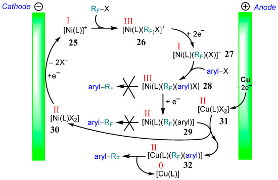 The proposed catalytic cycle (Scheme 17) involves a monovalent species [Ni(I)(L)] 25 (L = tpy or bpy), which is generated at the cathode. Oxidative addition leads to complexes [Ni(III)(L)(RF)X]+ 26; two electron reductions yield [Ni(I)(L)(RF)X]− 27. The oxidative addition of aryl–X substrates leads then to formal Ni(III) species 28, which are reduced again to yield the stable so-called σ-complexes [Ni(II)(L)(aryl)(RF)] 29. Importantly, neither the Ni(III) species [Ni(III)(L)(RF)X(aryl)] 28 nor the Ni(II) complexes [Ni(II)(L)(aryl)(RF)] 29 undergo reductive elimination to yield cross-coupling products aryl–RF [95,96]. Instead, the Ni(II) σ-complexes 29 transmetalate copper halide species to yield [Cu(II)(L)(RF)(aryl)] 32. They finally cleave the cross-coupling products through reductive elimination [72]. The halide complexes [Ni(L)X2] 30 were reductively reconverted to the initial Ni(I) species 25. To support the described mechanism, detailed cyclic voltammetry (CV) experiments and stoichiometric reactions were performed. It was shown that Cu(II) complexes such as [Cu(bpy)Cl2], [Cu(dmphen)Cl2] (dmphen = 2,9-dimethyl-1,10-phenanthroline), or [Cu(dppe)Cl2] (dppe = 1,2-bis(diphenylphosphano)ethane) under reductive conditions do not react with the RF–I with a noticeable rate, and their reduction behavior (potentials, reversibility) is not changed by the addition of RF–I. In contrast to this, the CVs of the corresponding nickel and cobalt complexes are sensitive to the presence of RF–I. The reduction wave of M(II) to M(I) for both Ni and Co complexes experienced a twofold increase in current with a loss of reversibility [52,72], which indicates the occurrence of oxidative addition RF–X to [M(I)(L)] without the cyclic regeneration of the catalyst. Regeneration of the catalyst would have led to a strong catalytic current in the presence of substrate [97,98], but this was not observed. Thus, the observed changes in CVs can be described by an ECE (electrochemical-chemical-electrochemical) scheme [50,52].