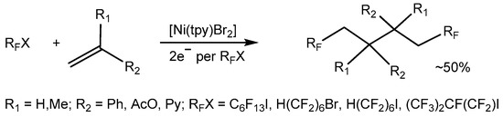 Electrochemical one electron reduction of [Ni(tpy)Br2] leads to an active species that can catalyze the addition of perfluoroalkyl radicals to olefins [53,99,100]. The electrocatalytic generation of a Ni(I) catalyst by reduction of a Ni(II)–tpy precursor complex in the presence of olefinic substrates and fluoroalkyl halides leads to new organic products derived from addition-dimerization processes (Scheme 19), showing a direct evidence of the importance of the four-coordinate low valent [Ni(tpy)Br] complex.