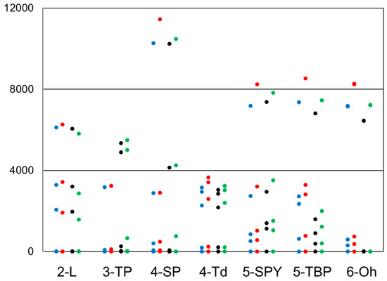 As mentioned earlier, several studies have established connections between molecular structure and magnetic anisotropy in mononuclear complexes based on transition metal ions. Thus, it is reasonable to consider the d-orbital splitting as the starting point for the discussion. Figure 1 shows the energy splitting of all of the studied geometries based on ab initio ligand field theory (AILFT) [19] energies for the d-orbitals (see Materials and Methods section for further information). Figure 2 presents molecular geometries for model complexes.