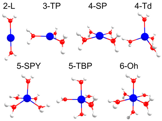 Molecular geometries for Co(II) model complexes. Structures are labeled using the code: 2-L (linear); 3-TP (trigonal planar); 4-SP (square planar); 4-Td (tetrahedral); 5-SPY (square pyramid); 5-TBP (trigonal bipyramid); 6-Oh (octahedral). Atom color code: Co (blue); O (red); H (white).