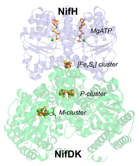 - Kaiser, J.T.; Hu, Y.; Wiig, J.A.; Rees, D.C.; Ribbe, M.W. Structure of precursor-bound NifEN: A nitrogenase femo cofactor maturase/insertase. Science 2011, 331, 91–94. [Google Scholar] [CrossRef] [PubMed]