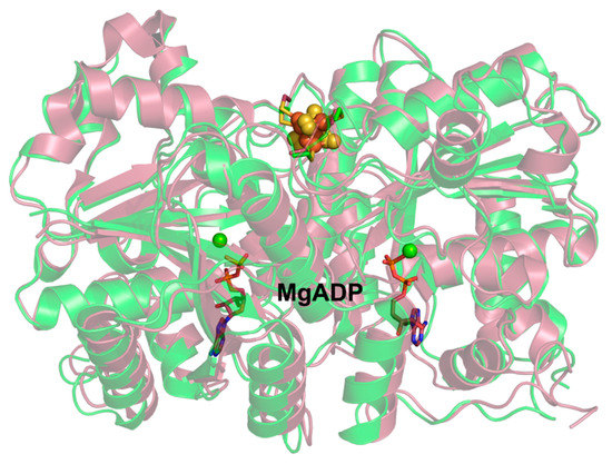 - Schindelin, H.; Kisker, C.; Schlessman, J.L.; Howard, J.B.; Rees, D.C. Structure of ADP·AlF4—Stabilized nitrogenase complex and its implications for signal transduction. Nature 1997, 387, 370–376. [Google Scholar] [CrossRef] [PubMed]