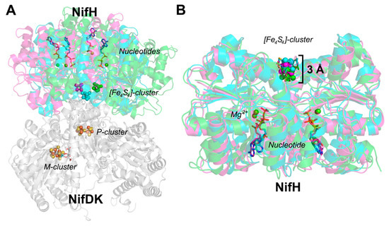 - Strop, P.; Takahara, P.M.; Chiu, H.-J.; Angove, H.C.; Burgess, B.K.; Rees, D.C. Crystal structure of the all-ferrous [4Fe-4S]0 form of the nitrogenase iron protein from Azotobacter vinelandii. Biochemistry 2001, 40, 651–656. [Google Scholar] [CrossRef] [PubMed]